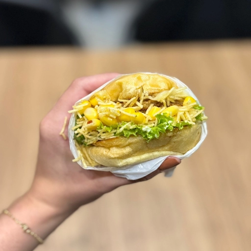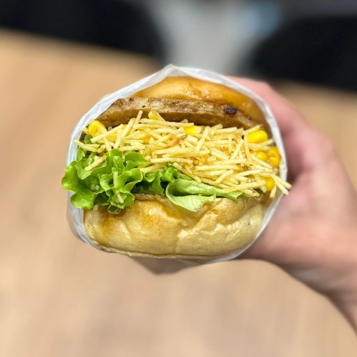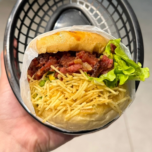 Pão, carne, mussarela, alface, tomate, milho, batata palha