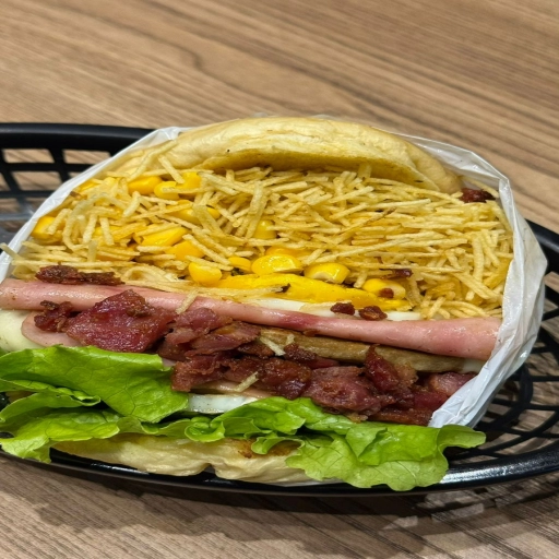 Pão, carne, mussarela, ovo, bacon, alface, tomate, milho, batata palha