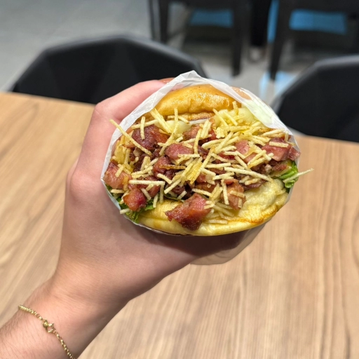 Burger de 150g, bacon crocante, alface, tomate, cebola roxa, molho especial, pão de brioche e queijo muçarela