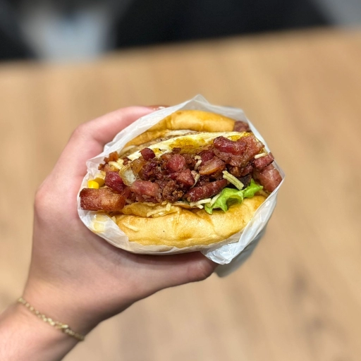 Pão de brioche, 2 smash 90g, queijo cheddar cremoso, cebola caramelizada, bacon
